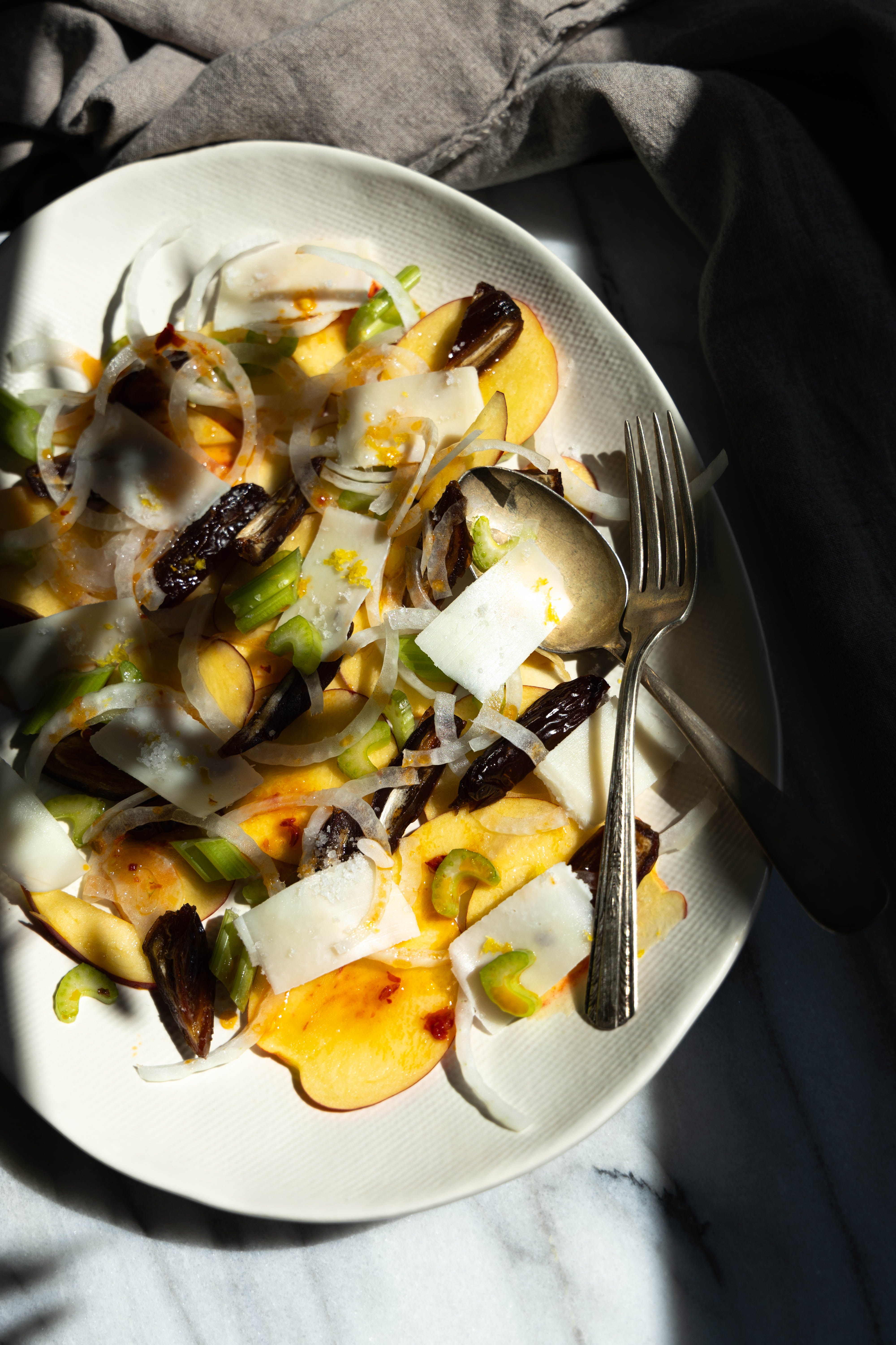 Thinly slice a few nectaries (this can also be plums, apples, peaches, apricots), half a white onion and arrange on your plate of choice. You can stop there and finish with a drizzle of olive oil and sea salt. Or continue with roughly chopped dates, celery, and shaves of manchengo.