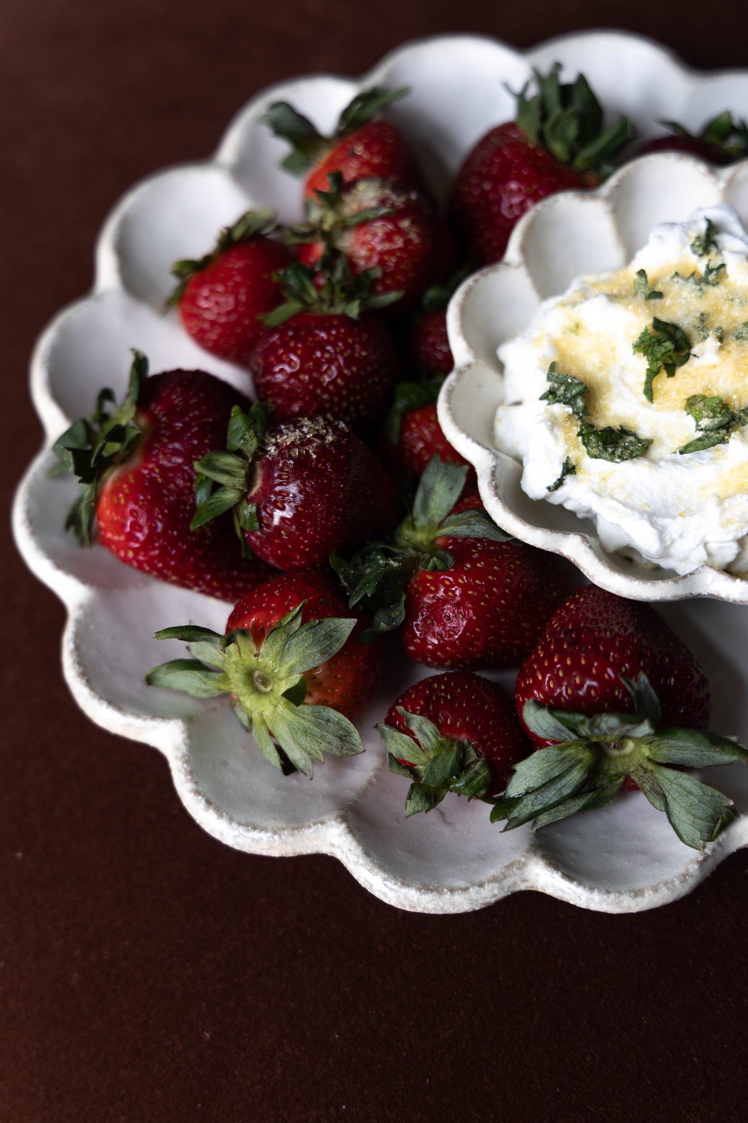 A plate of glimmering strawberries neighbored with a bowl of freshly whipped cream (simply whip together 1 cup of cream, 2 teaspoons confectionary or granulated sugar and 1/2 teaspoon vanilla extract) or a few spoonfuls of room temperature mascarpone finished with torn basil is one of the oldest combinations in the book but often not given enough attention.