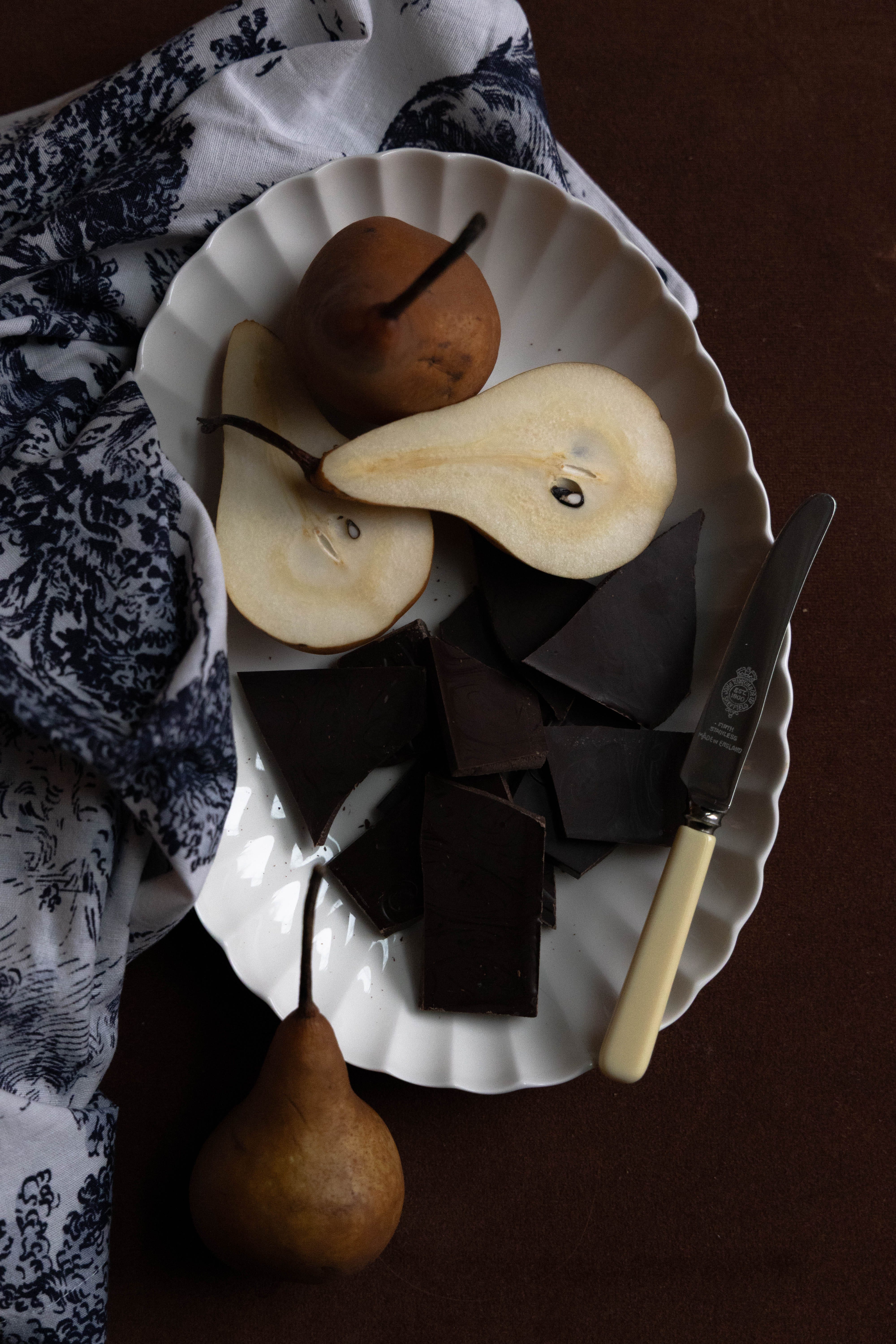 An elegant dessert option that does not get simpler. Break off a few chunks of a good quality chocolate bar, slice whatever fruit is lying around, arrange across your favorite plate and you have a convivial aperitif to keep the conversation flowing.