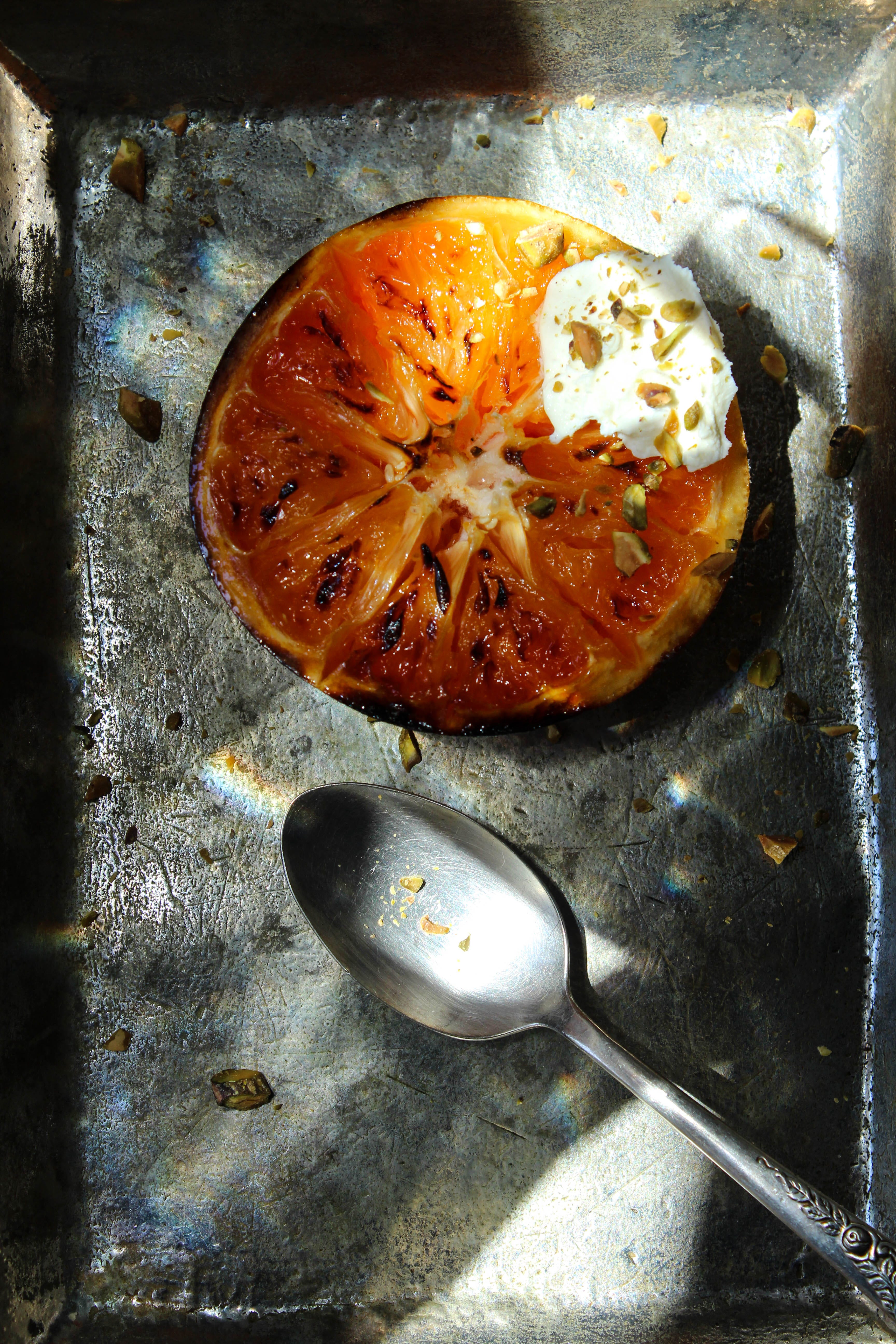 Slice a grapefruit in half and sprinkle a good couple teaspoons of granulated sugar across the top. Place them sliced side up on a baking sheet. Turn the broiler on and slide in the sheet. Watch carefully as they turn to a shimmering gold. This is the signal to remove them and turn that broiler off. Finish with a dollop of marscapone or creme fraiche and chopped pistachios (or walnuts or almonds).