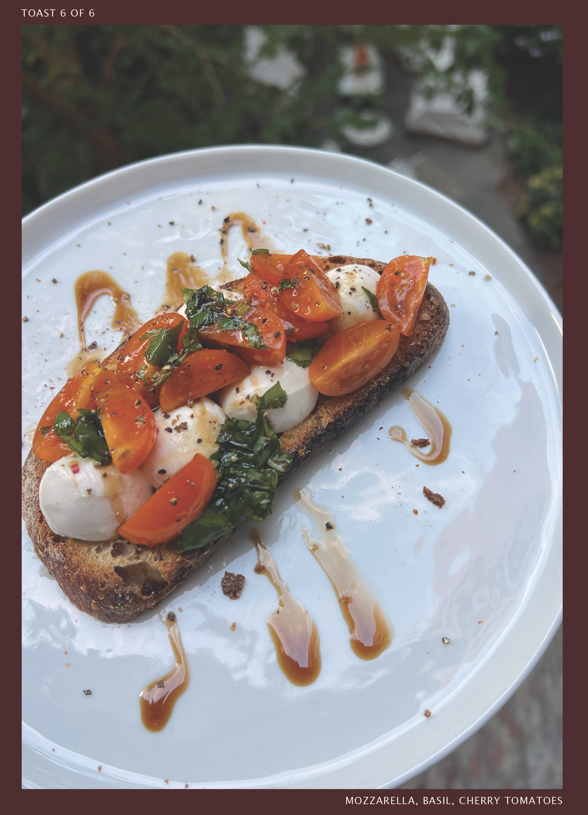 Halve a handful of cherry tomatoes and toss them in a bowl. Drizzle with extra-virgin olive oil, balsamic vinegar, salt, pepper, and torn basil. Mix and set aside. Cut 3-4 mozzarella ciliegine (cherry-sized mozzarella balls). Toast up a slice of bread and rub a garlic clove on one side of the bread with a drizzle of extra-virgin olive oil, and put it on your plate. Place the mozzarella cut side down across the bread, but make sure you leave some empty pockets. Fill in the empty spaces with the marinated tomatoes and drizzle with balsamic glaze and a few cranks of pepper.