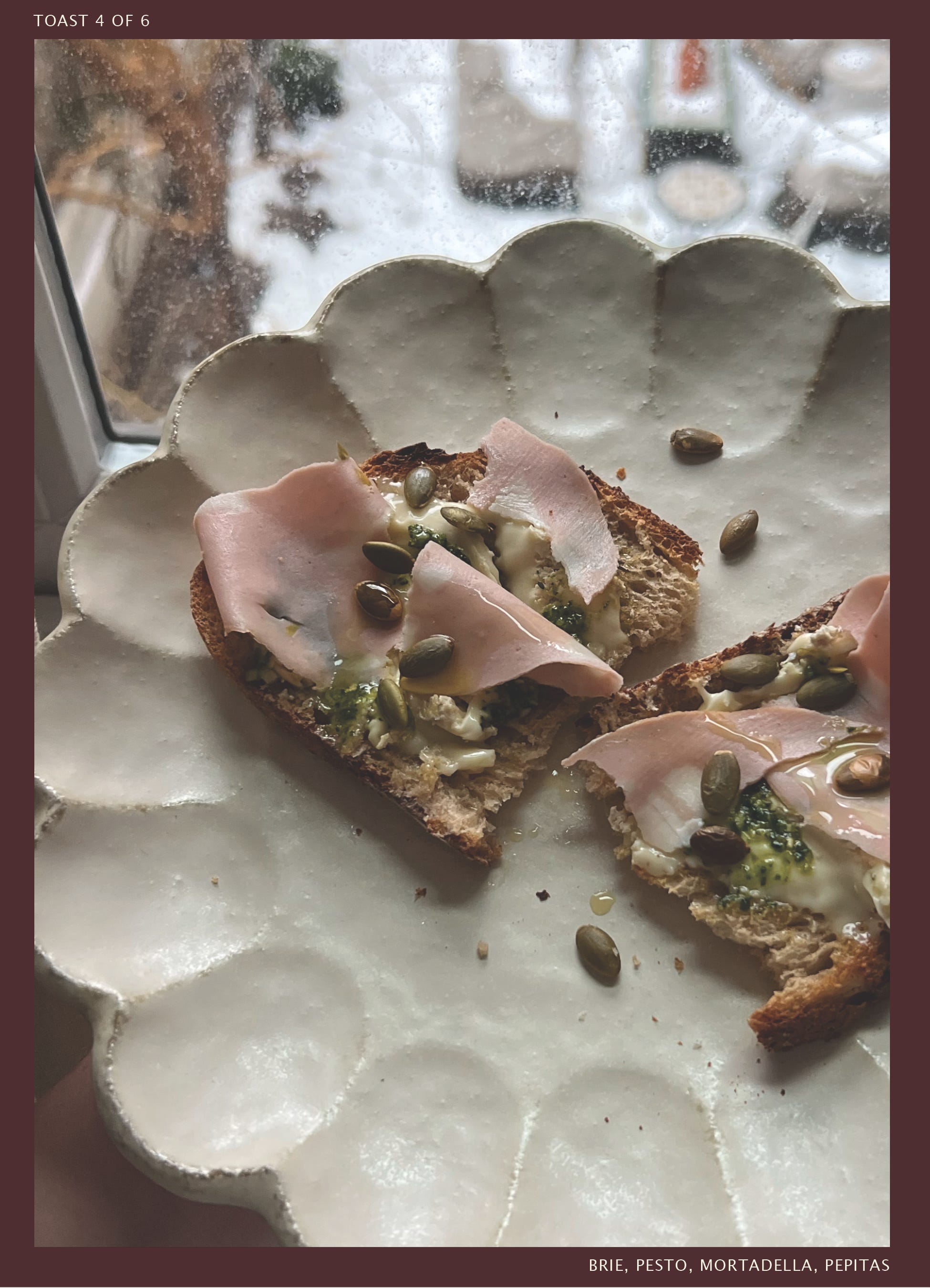 You know the drill by now: toss a piece of bread in the toaster. Once done, drizzle with olive oil and knob off a piece of creamy brie and spread it across the warm toast. Smear fresh pesto (this is great when you have leftover from a pasta sauce, I always like to have some in my freezer for dinner when I’m in a pinch, you can grab the recipe here) across the brie. Layer with torn mortadella, toasted pepitas, and finish with a silky touch of extra-virgin olive oil.