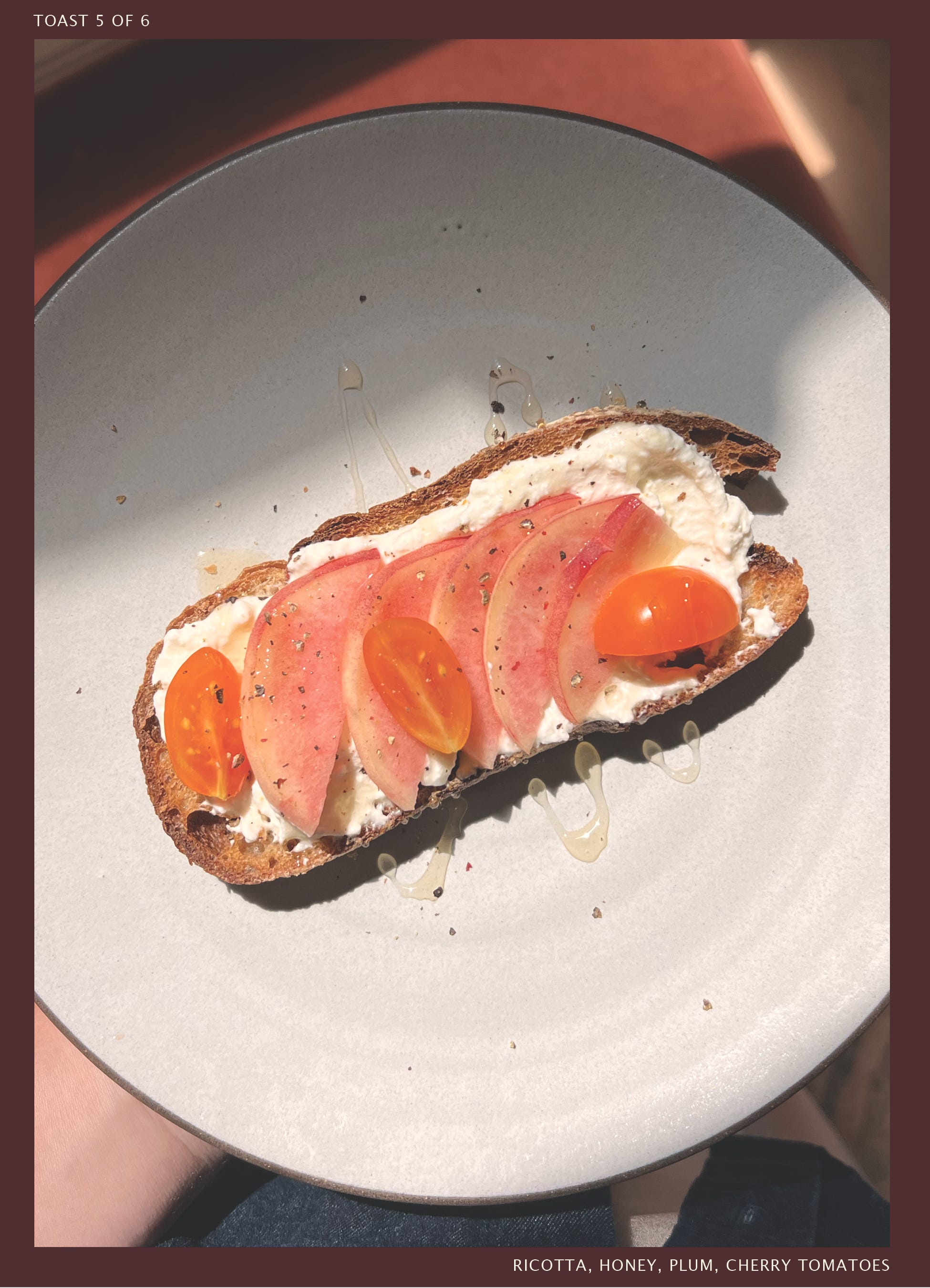 Scoop a couple of heaping spoonfuls of ricotta into a small bowl. Drizzle in a good dollop of honey and a pinch of salt and pepper. Whisk until smooth and creamy. Taste to see if you need to add more honey and then set aside. Toast up a slice of sourdough, thinly slice half a plum, and halve a couple of cherry tomatoes.