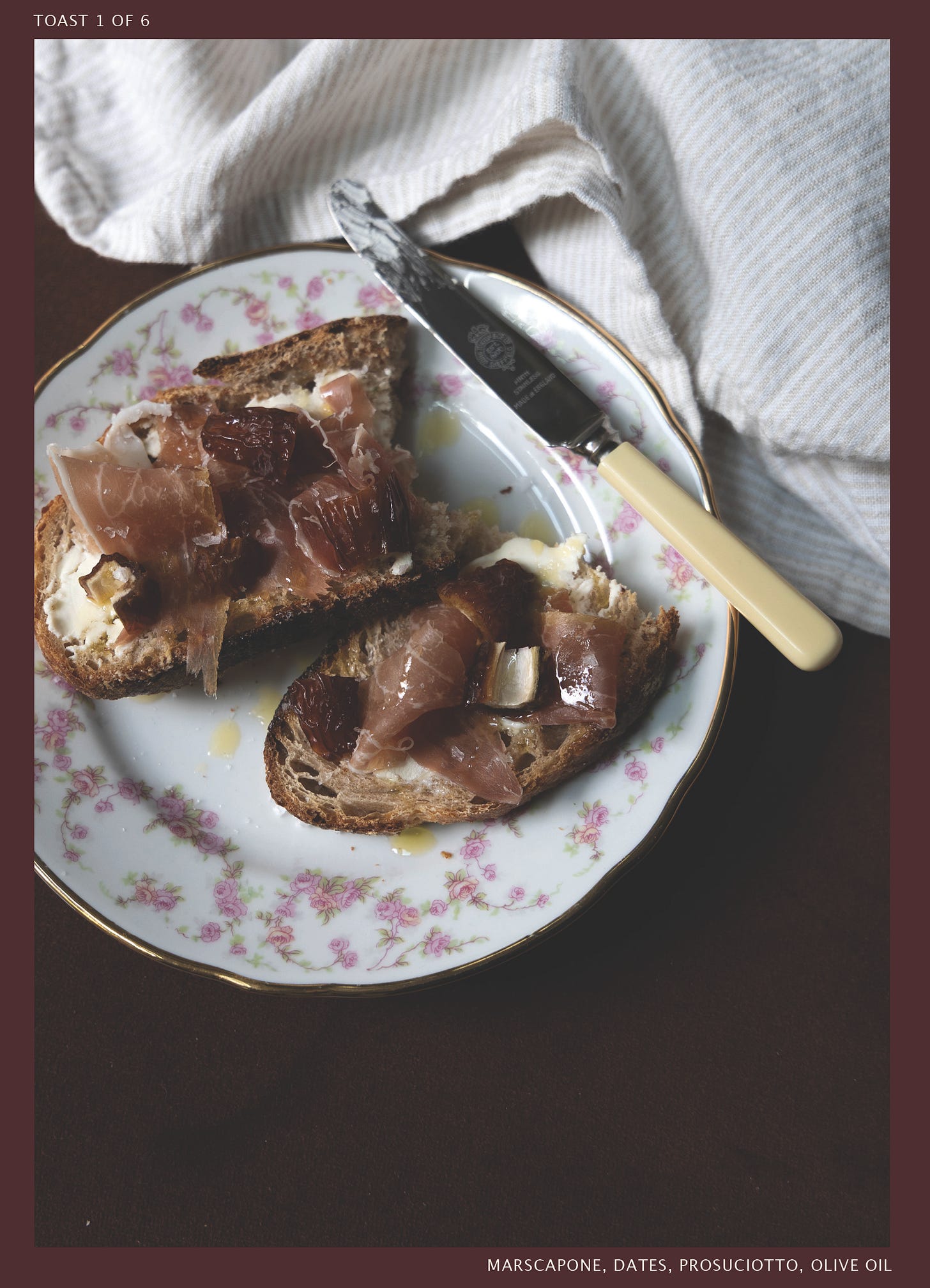 Toss a hearty slice of sourdough or two into the toaster. While it is toasting, roughly chop a few dates, tear a couple of pieces of prosciutto, and take the mascarpone out of the fridge. Once the toast is ready, I like to grab a garlic clove and rub it over both sides of the bread and drizzle olive oil. Then, once slightly cooled (I don’t want the mascarpone to melt), I will spread a nice layer of the mascarpone, layer it with the prosciutto di Parma, dot it with dates, and finish it once more with a healthy drizzle of good extra-virgin olive oil and flaky sea salt.