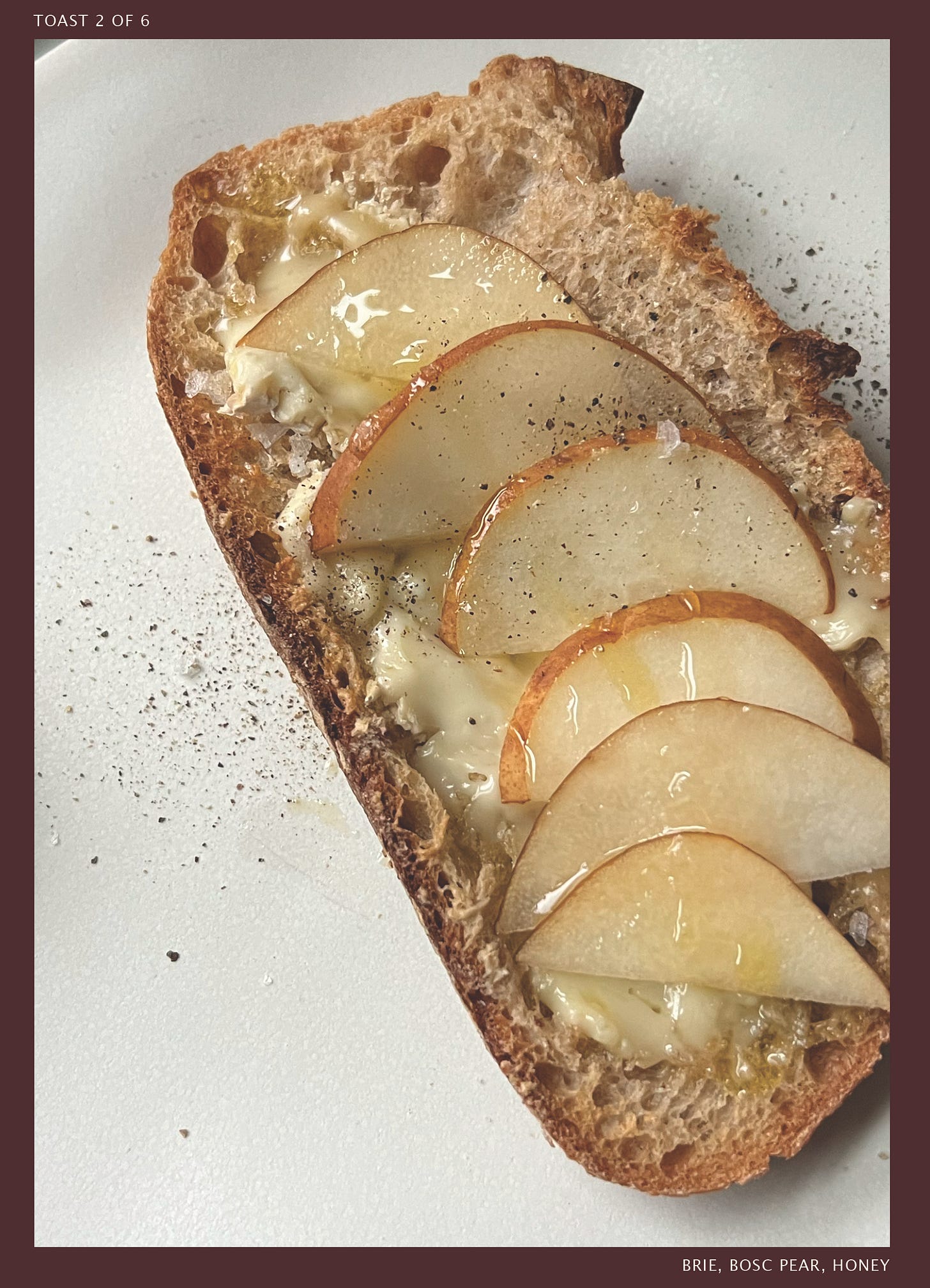 Toss a slice of bread into the toaster until golden brown then drizzle some extra virgin olive oil. Slice off a knob of brie and smear it across the toast. Thinly slice about a 1/4 of a pear and lay it across the toast on top of the brie, and finish with a healthy drizzle of honey and a few cracks of pepper.
